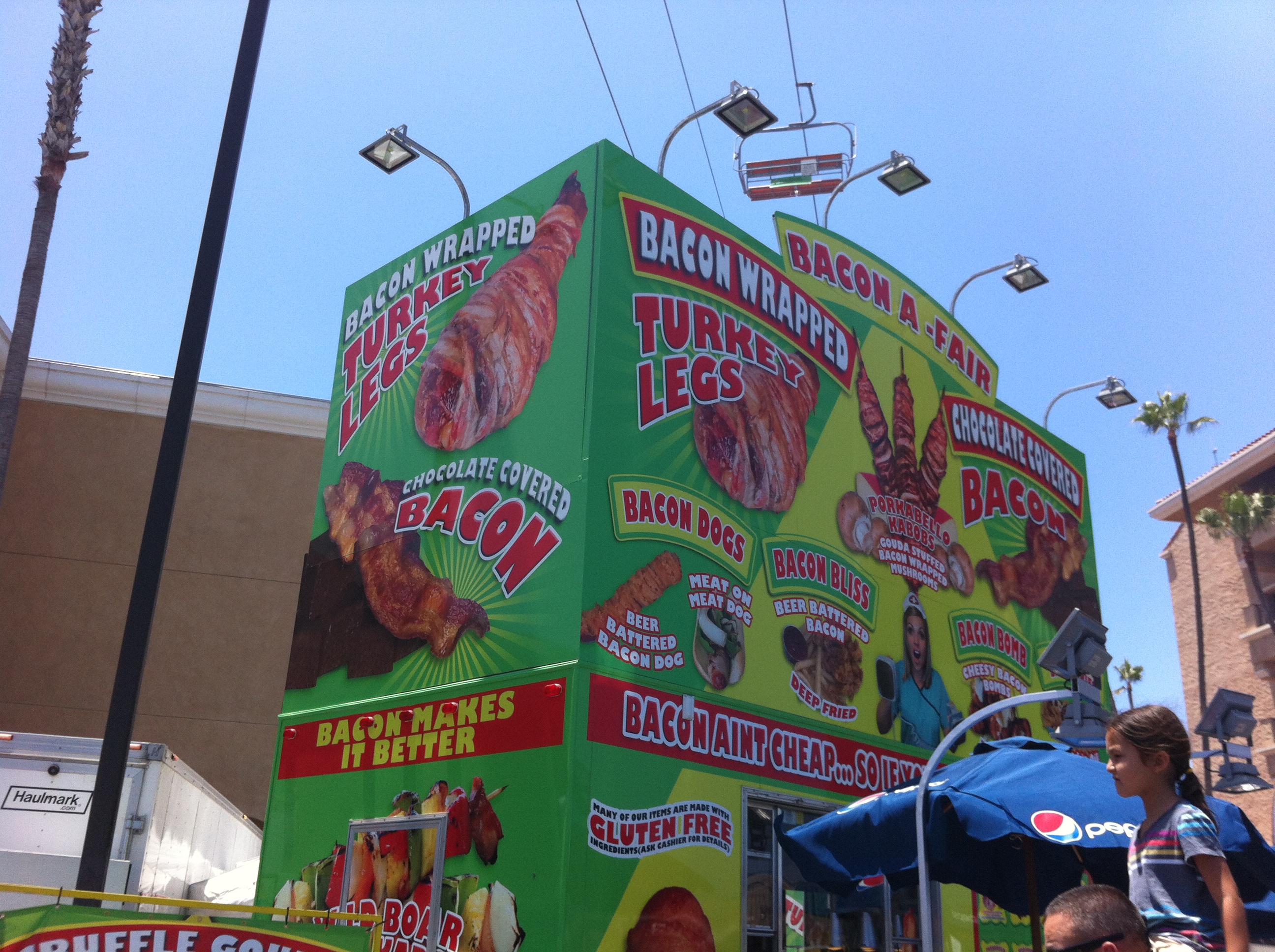 Then the aroma of the fair food is so tantalizing, and the choices are plentiful! What to get? Ice cream, funnel cakes, pizza, Greek food, fish and chips, Indian bread (I believe it was the American Indian, not the other Indian), caramel apples, just about anything covered with bacon – including chocolate, or hot dogs are just some of the temptations. The fries covered with nacho cheese and bacon bits were really good! However, it is costly – $10 or so for a chicken basket that consisted of four pieces of chicken with fries, $6.75 for the bacon covered fries, $15.75 for three slices of pizza with two drinks, and should I even go on? But, it’s tempting and you have to be really strong to resist those wonderful tantalizing smells, they can even make those who are full – just greedy. It’s the Fair, and you have to give in just once in a while!